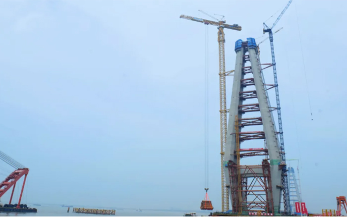 巢马铁路马鞍山长江大桥是世界最大跨度三塔斜拉桥,主塔总高345m,采用XGT15000-600S塔机进行上部钢塔柱施工吊装仅需将钢塔柱划分为13个吊装单元 蓝莓TV,最大单元重量超550t,较传统施工方式效率提升65%以上。