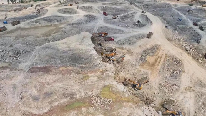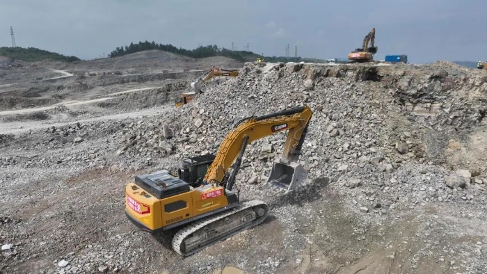 前期爆破剥离工序后,徐工20吨挖掘机搭配140的小破碎锤进行二破,同时XE380GK,XE600GK等机型进行挖装作业 蓝莓TV高清播放,现场共投入挖掘机50多台,每天的挖方量在10万方左右。