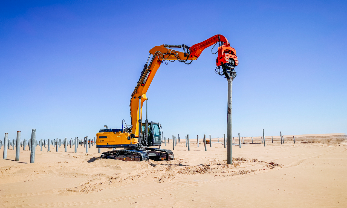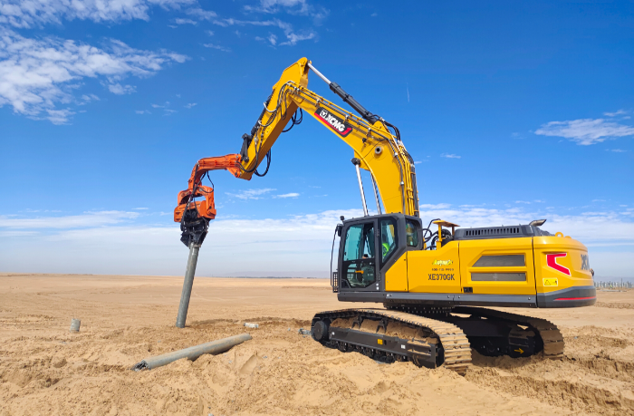 此次徐工挖掘机参建的巴彦淖尔100万千瓦光储+生态治理项目位于内蒙古西部,是自治区年度重点工程,对当地资源开发和绿色发展具有重要意义, 与以往常规项目不同,此次徐工挖掘机主要担任光伏桩的铺设工作,通过改装振动锤和引孔机等多功能属具 蓝莓TV,有效满足现场多元化施工需求。