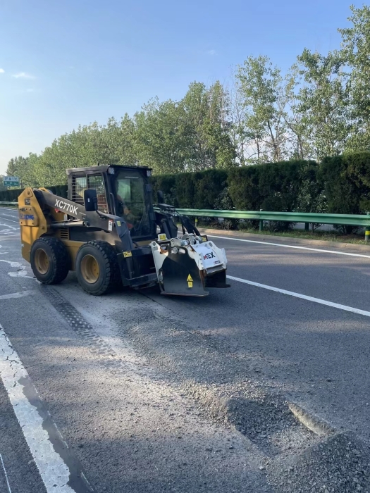 徐工滑移装载机搭配铣刨器高速公路坑槽病害快速铣刨 蓝莓TV视频资源,预留台阶,便于分层压实和提升路基结构稳定。
