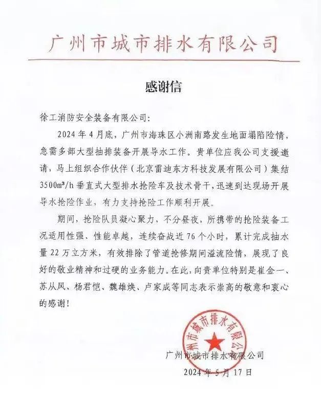 近日,徐工消防收到一封来自广州市城市排水有限公司的感谢信 蓝莓TV,信中热忱感谢徐工在广州市海珠区某地地面坍塌险情中提供的高效,专业的设备及人员支持。