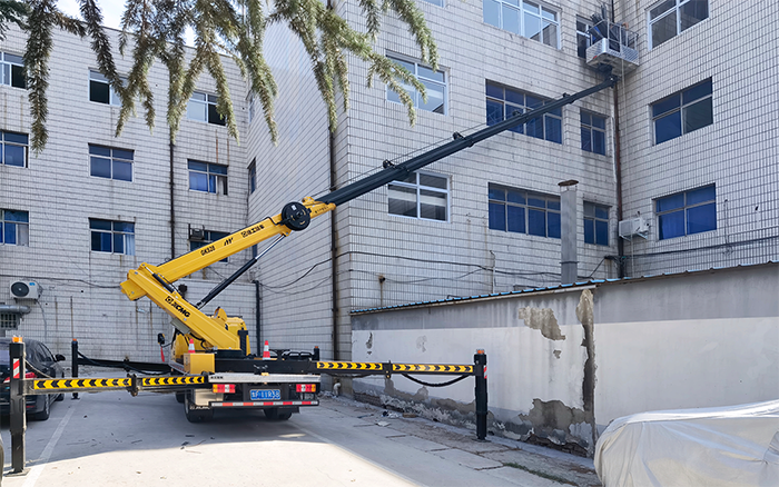 在现场可以看到,GKS28D结构紧凑,整车尺寸小 蓝莓TV视频资源,能在小区狭窄道路内穿梭自如,作业斗将钢架物料和一名施工人员平稳快速运送至起始作业点位,从右至左依次安装钢架,设备作业幅度覆盖整排楼体外立面,可轻松到达指定位置,同时,无线遥控器能够帮助检修人员“无死角”观察到作业平台位置,大大提高了移动效率和精准度。