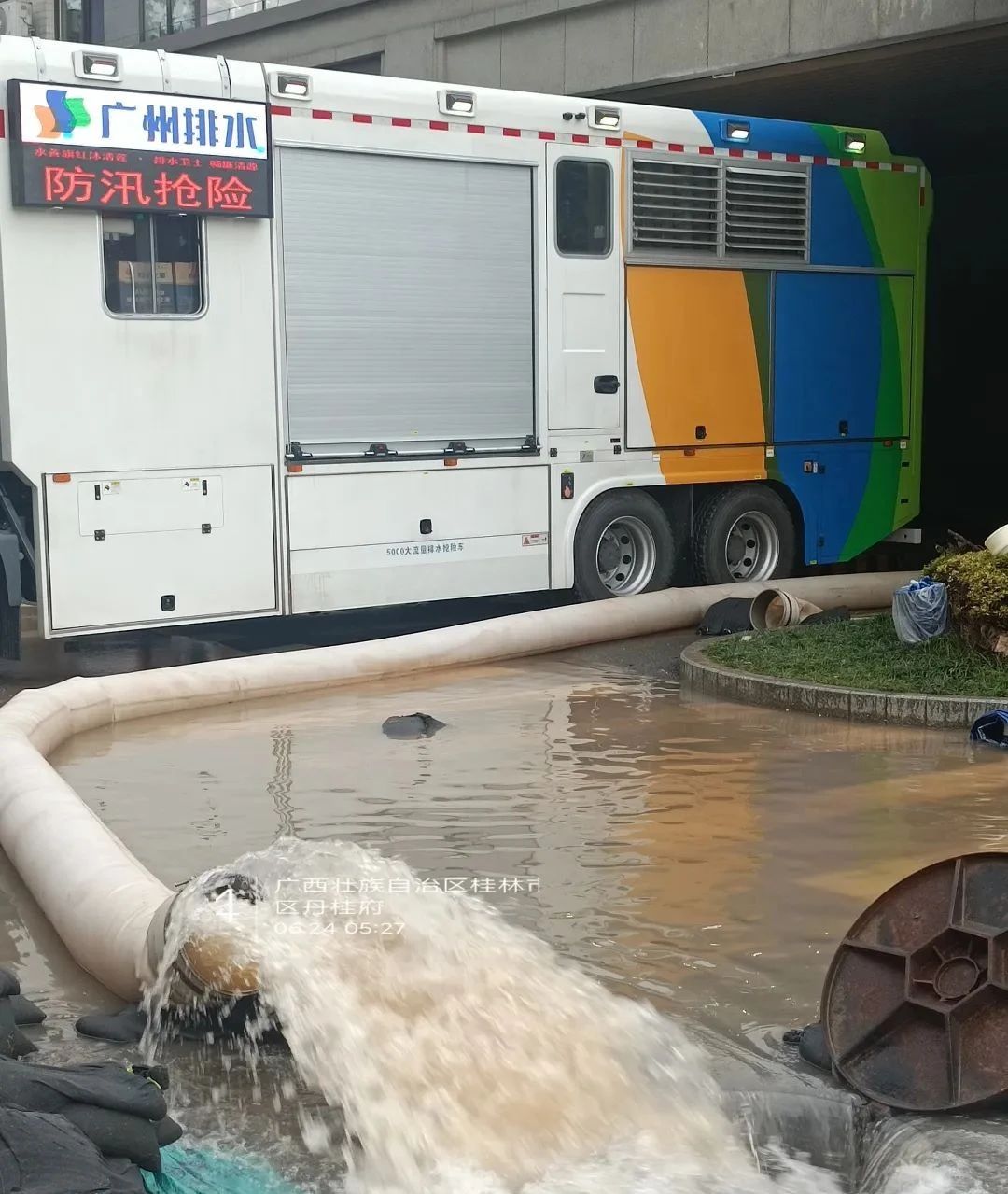 位于桂林七星区的丹桂府小区,地下车库占地面积超50000m³,高度约3 蓝莓TV高清播放,5m,也同样遭受到洪水的侵袭。来自广州排水的徐工PS50B泵组式大流量排水抢险车迅速赶来,进行定点强排作业。十余小时加大马力连续抽排积水。顺利完成任务后,该台设备又迅速赶往下一救援场地。。