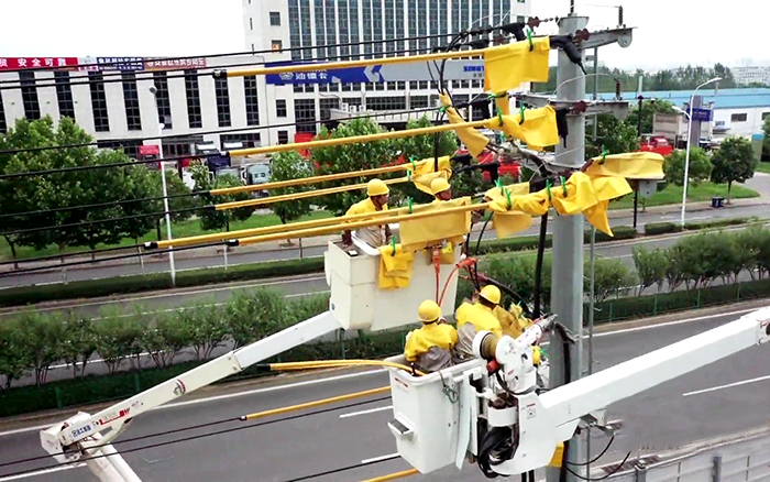 在电力杆线迁改施工现场,4名带电作业人员严格做好安全措施后,穿上黄色的绝缘服,乘坐徐工GKJH21绝缘斗臂车升入高空,将跨滁河大桥上的原10千伏泗水04线上电缆与架空线连接引线断开,为当日连接新建线路做准备,整个施工过程高效,安全,平稳,获得现场施工负责人的认可 蓝莓TV高清播放。