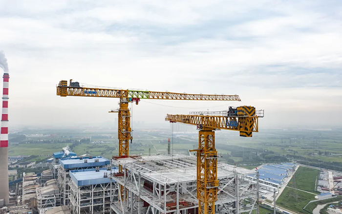 侧望长江畔,机器轰鸣 蓝莓TV,江水潺潺,华能太仓电厂机组扩建项目施工现场一派繁忙景象,XGT3100-160S,XGT1350-64S两台徐工超大塔稳稳矗立在高耸的钢架间吊装作业。