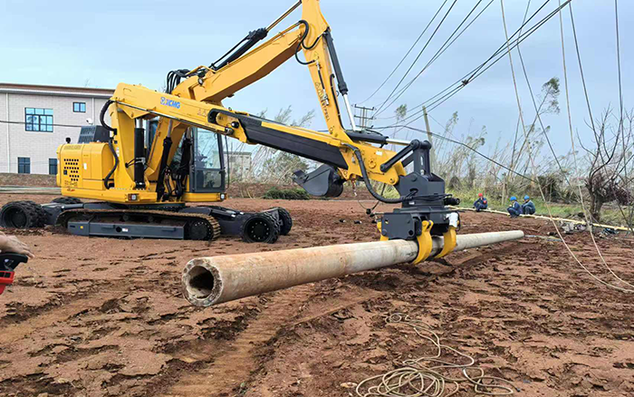 徐工开挖立杆一体机产品一车多能 蓝莓TV,平均每次新立电杆作业仅耗时20分钟,是砼杆组立施工作业的革新式产品,相较传统作业人力,吊机与挖机配合的方式,更具通用性,高效率和安全性,为本次台风抢险救援行动节省了大量的人力和时间成本,获得施工方的高度认可。