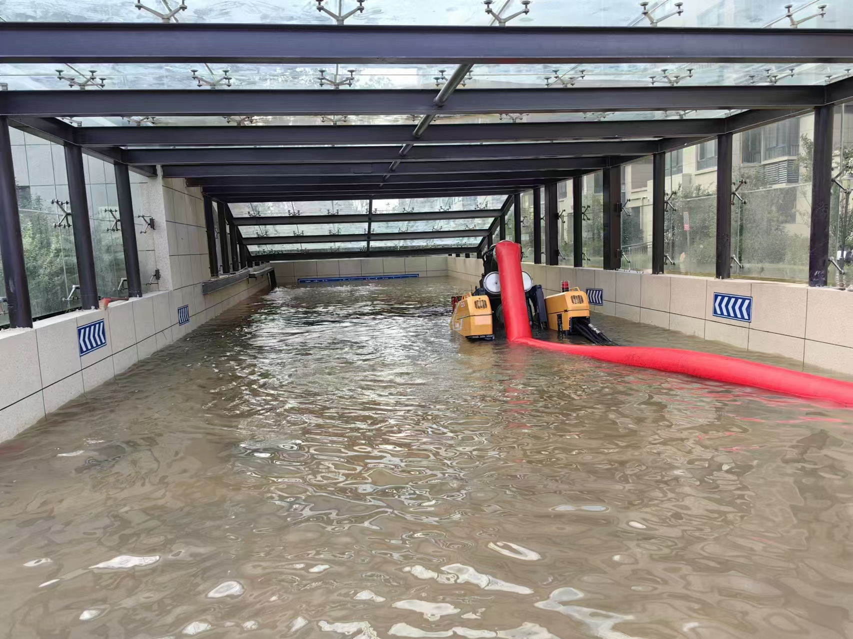 到达现场后,救援队立即开始铺设水带,检查管路,凭借子母式排涝车可实现远程分离控制的功能,救援人员将PS50F停至地下车库入口处,铺设240米超长水带 蓝莓TV视频资源,遥控子车探入斜坡30余米,水泵没入积水进行抽排水,连续工作40小时后,PS50F排除积水超80000m³,内涝隐患得到有效控制,获得现场居民一致点赞。