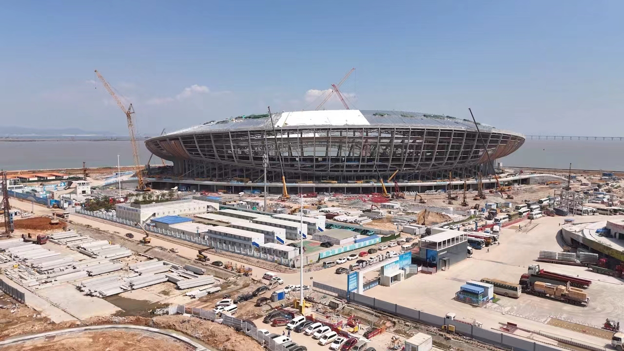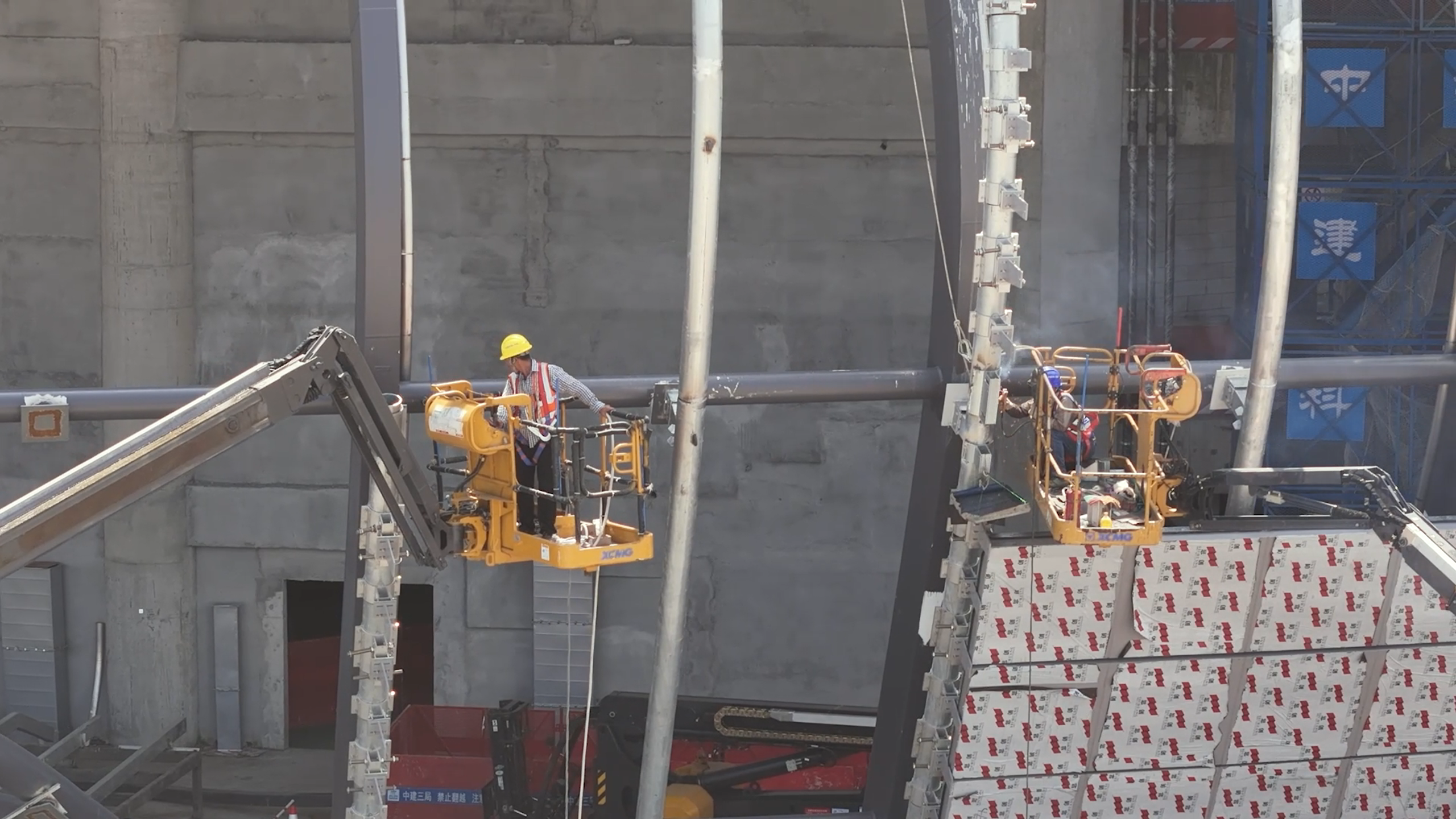 近日 蓝莓TV,徐工多台大米级高空作业平台亮相广州南沙体育馆项目,进行钢结构焊接及安装工作。