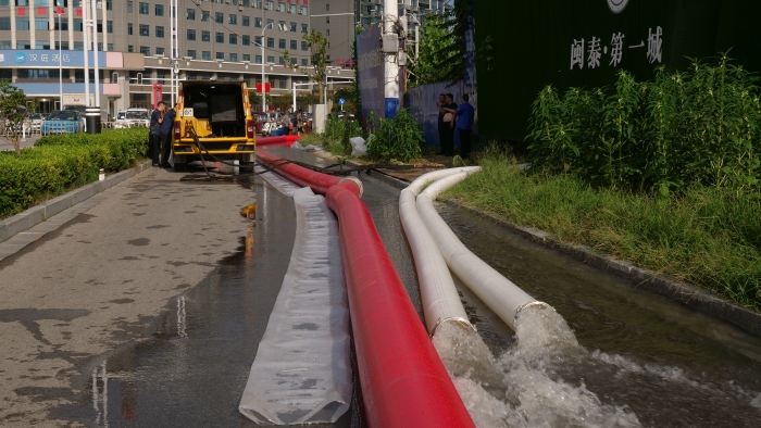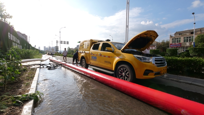 调试车辆,铺设水带,检查管路,现场排水作业紧锣密鼓地进行着,XGH5030TPSQ6争分夺秒与时间赛跑,每台车流量超600m³/h 蓝莓TV视频资源,最大可达1000m³/h,将积水源源不断地排入下水道中。