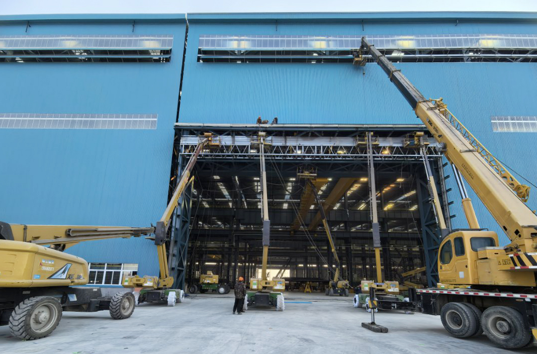 在恒力重工三期厂房建设工地 蓝莓TV,近10台30米级徐工高空作业平台正大显身手,忙碌于车间内外钢结构建设与墙面装饰等精细作业。
