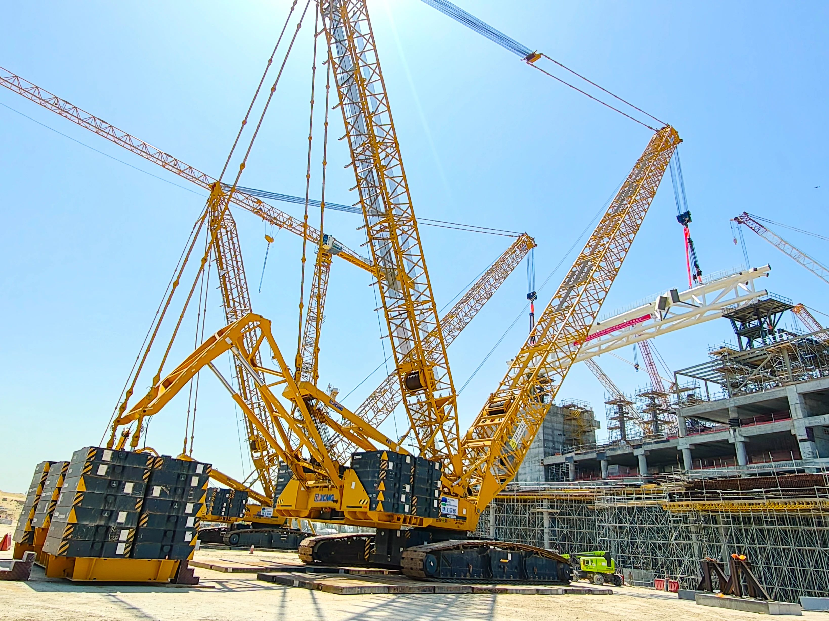 徐工两款大吨位履带式起重机——XGC15000A(1000吨级)与XGC12000(800吨级)强势出击,施工现场,XGC15000A以85米超起重型主臂应对超高作业需求,吊装过程平稳高效,XGC12000则采用84米超起重型主臂形成科学夹角,大幅提升拆装效率 蓝莓TV高清播放。