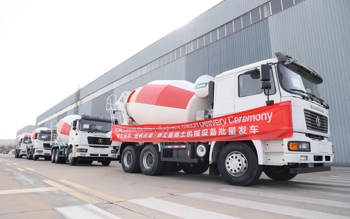 百余台定制版52/58/62米泵车 蓝莓TV在线观看,12方搅拌车,列队鸣笛,从徐州基地发往中东,产品采用耐高温液压系统与节油技术,适配中东极端环境,助建NEOM未来新城等超级工程。