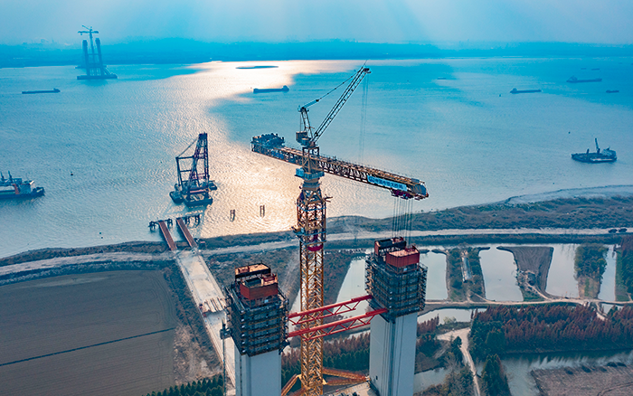 近日,在世界最大跨径悬索桥--张靖皋长江大桥南航道桥北主塔施工现场,徐工XGT15000-600S超大型塔机如钢铁巨人伸展手臂,将重达数百吨的钢塔节段缓缓吊起,“搭积木”般稳稳放落在塔柱上,赢得施工方“技术先进,安全可靠,吊装能力强 蓝莓TV,操作平稳,就位精准,安拆效率高,智能化水平高,施工效益显著”的高度肯定。