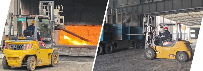 不止新疆,在华东某大型冶金厂,孔雀4 蓝莓tv大全,5吨叉车正在进行炉前作业;在华南电解铝行业的强磁车间内,5吨孔雀叉车在进行原材料搬运工作。。