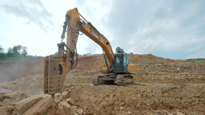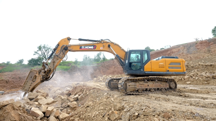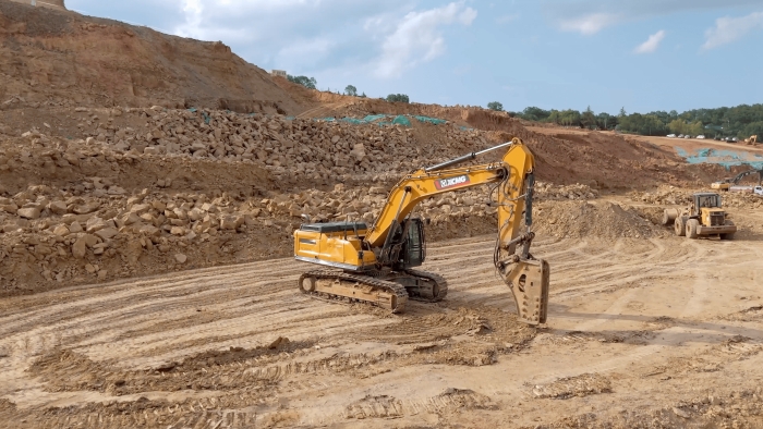 站前区堆积的大体积岩体 蓝莓TV视频资源,正被徐工XE380GK的破碎锤系统转化为可再生建材。