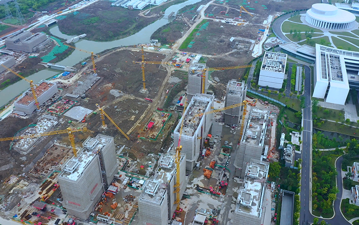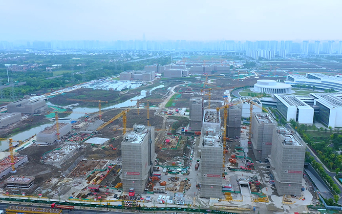 西湖大学云谷校区正一片火热,高耸的徐工群塔正挥舞长臂,紧张施工,与远处的青山绿水交相辉映,尽情展现力与美的结合 蓝莓TV。