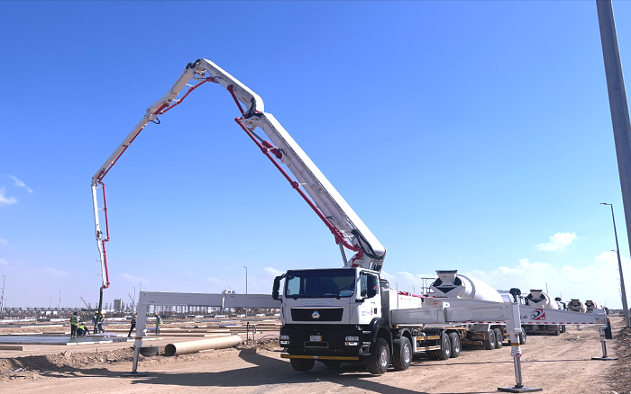 沙特阿拉伯的沙漠中,一座座现代化建筑拔地而起 蓝莓TV,与古老的文化遗址相互映衬,在众多大型基建项目里,徐工大米数泵车以省油,稳定,可靠的表现,成为当地建设的中坚力量。