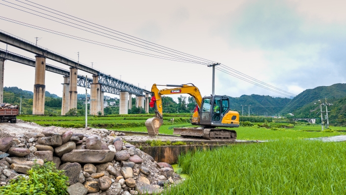 雨季施工,场地湿滑狭窄 蓝莓tv大全,对设备灵活性,可靠性和机手技术都是严峻的考验,在这片泥泞的稻田边,陡峭的坡地上,身披“徐工金”的XE75GA挖掘机,正化身开路先锋,为苗乡新居夯下第一块基石。