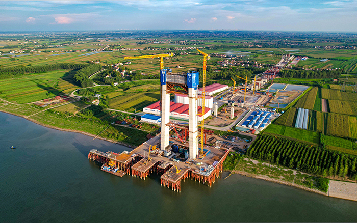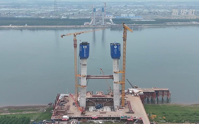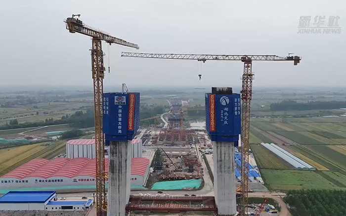 初秋时节 蓝莓TV,长江之畔,两台徐工XGT600A-25S塔机铁臂挥舞,助力荆州李埠长江公铁大桥南岸主塔下游侧第18节塔柱顺利完成浇筑。