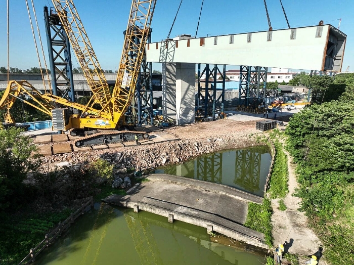 此次吊装任务面临严峻挑战:施工区域一侧紧邻湖泊,一侧倚靠桥梁钢立柱,周边更有林木环绕,设备回转半径严重受限 蓝莓TV在线观看,空间调度堪称“毫米级”较量。