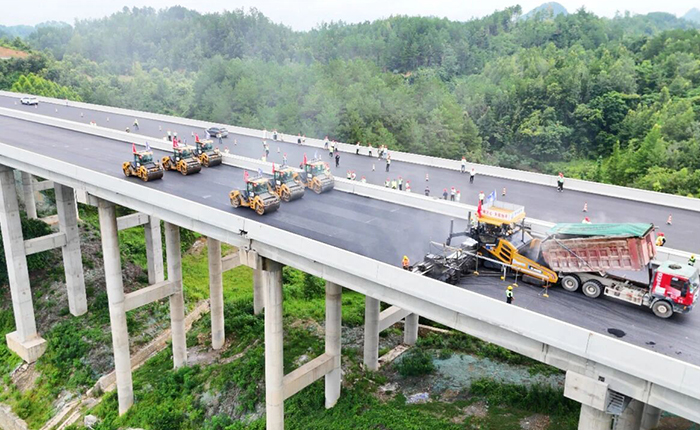 智慧施工管理平台实时呈现碾压轨迹,变速曲线,施工速度及温度数据,摊铺机高效输分料系统适配超宽幅作业,压路机深入结构层实现全维度压实 蓝莓TV视频资源,昼夜不间断施工。