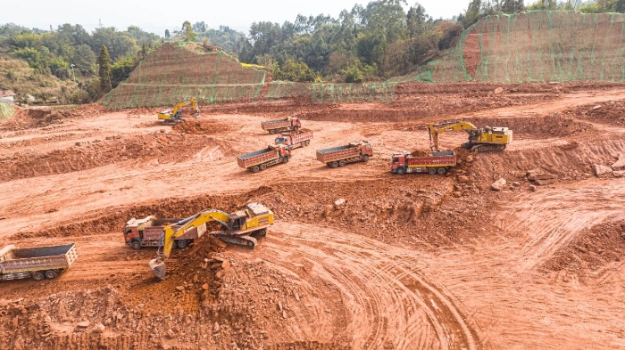 四川乐山,一座关乎区域经济发展的重点工业园区正拔地而起 蓝莓TV,施工现场,机械的轰鸣声奏响着发展的号角,运输车辆如织般往来穿梭,一派生机勃勃的建设图景在此铺展,在这幅宏大的画卷中央,十余台身披“徐工金”的60吨级大型挖掘机尤为醒目,它们以其沉稳有力的臂膀,成为推进项目进程当之无愧的“主力军”。