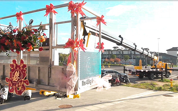 这辆 GKS45A 高空作业车刚完成交付,客户便别出心裁地将其打造成婚车,车头的 “囍” 字鲜艳夺目,车身缠绕的红绸与花束将机械的硬朗感与婚礼的浪漫感巧妙融合,在喜庆的音乐与路人的祝福中,它行驶在婚车队列之首 蓝莓TV在线观看,成为新人幸福旅程的 “硬核” 见证者。