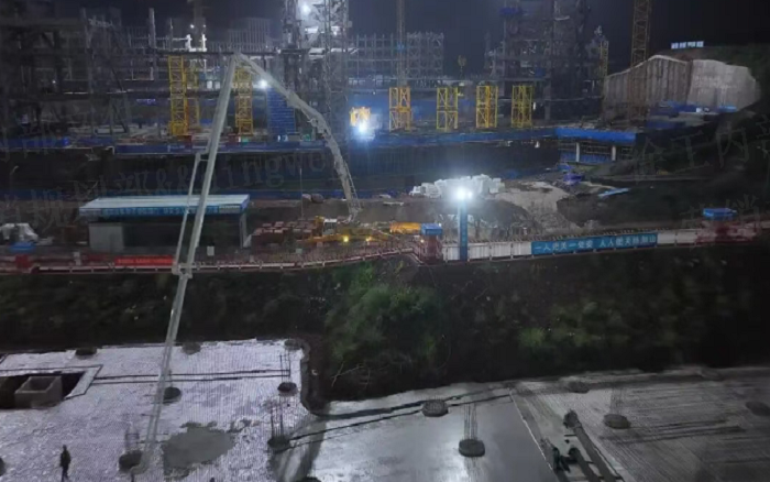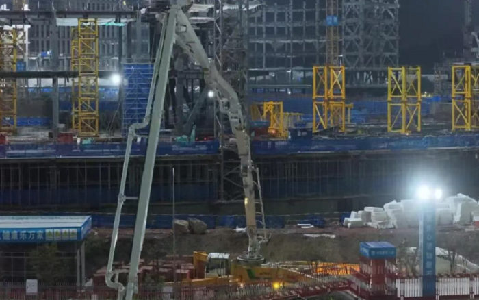 凌晨三点的重庆两江新区,徐工72米泵车展臂高空 蓝莓TV,20辆新能源搅拌车穿梭往来—这不是科幻电影场景,而是徐工混凝土成套化装备助建重庆赛力斯全球汽车公园的火热夜战场面。