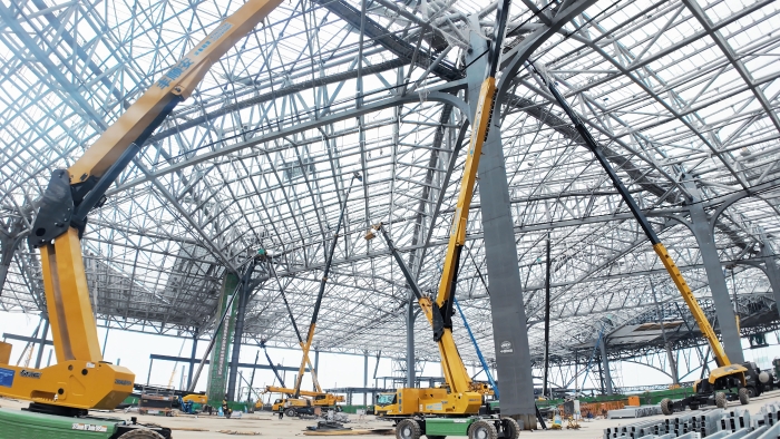 西安东站建设工地上,徐工高空作业平台组成“钢铁军团”正全速推进施工,10余台30-40米直臂车伸展巨臂,精准对接站房屋顶钢结构焊接,12米剪叉车灵活穿梭,高效配合内部砌墙作业 蓝莓TV。