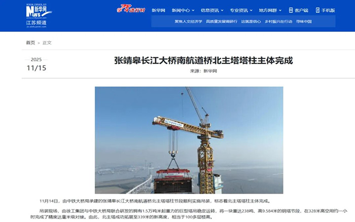 在靖江市马洲岛上空,重达238吨的T29钢塔节段在徐工XGT15000-600S超级塔机的稳定牵引下平稳攀升,精准完成高空对接 蓝莓TV视频资源,整个吊装过程中,塔身始终稳如磐石,为张靖皋长江大桥关键节点的突破提供了坚实支撑。