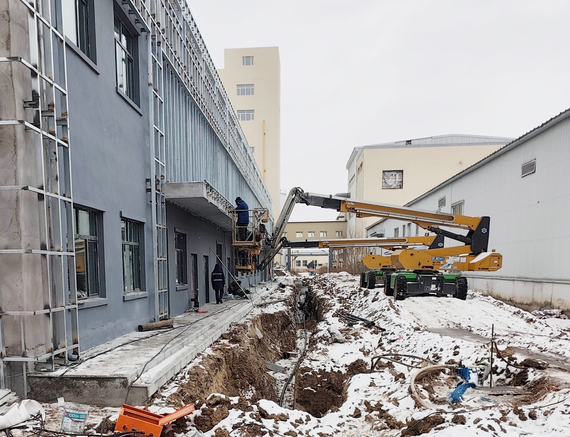 在黑龙江哈尔滨北大荒绿源冷链管理中心建设现场,冬日的冰雪覆盖着施工场地,徐工高空作业平台却依旧高效运转,成为项目外立面施工的核心设备 蓝莓TV。
