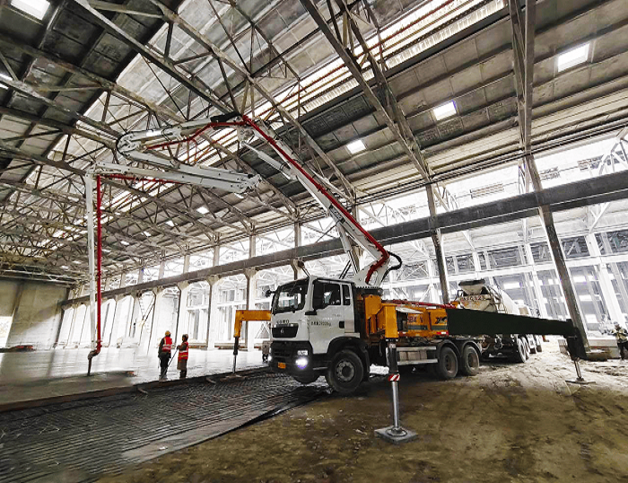 HB43V泵车搭载五节“RZ”型折叠布料杆,370°灵活旋转无施工死角 蓝莓TV在线观看,凭借高效泵送能力适配大面积地坪连续浇筑需求,精准满足C30混凝土强度与平整度标准。