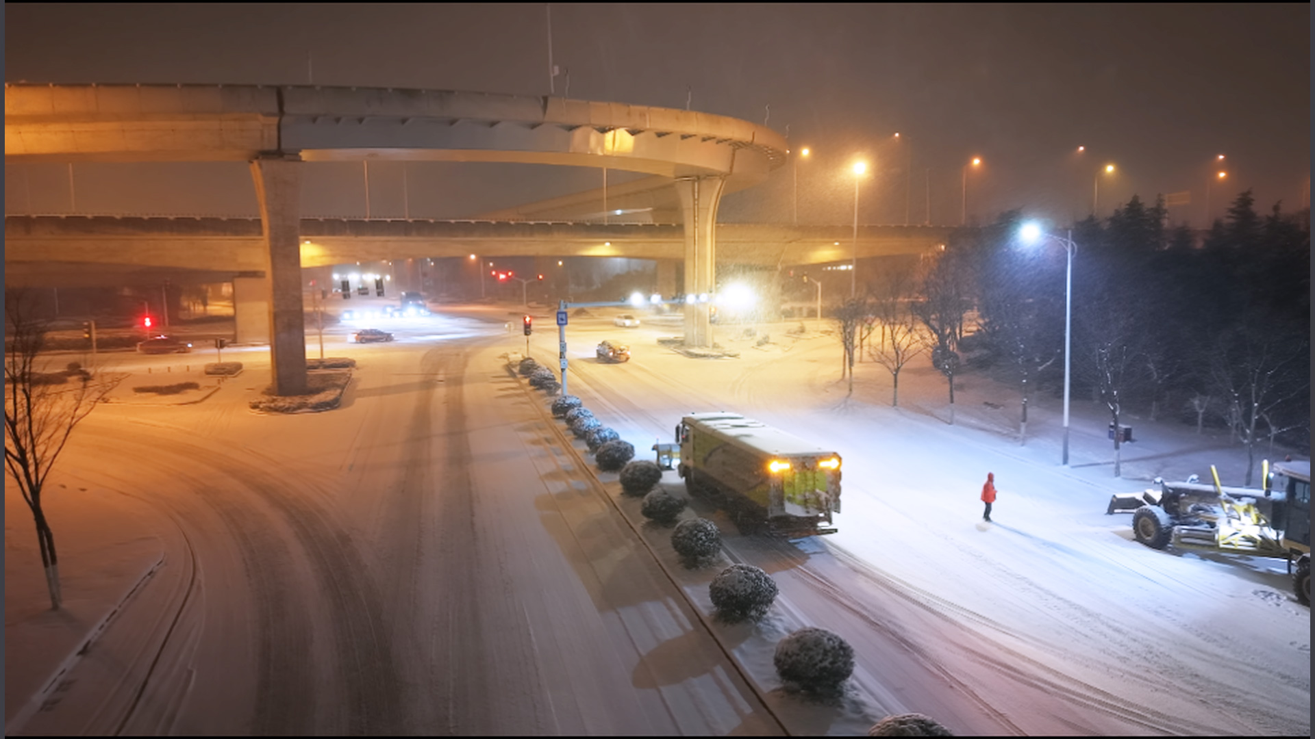 1月20日0点,徐工除雪设备和救援队在徐州东三环快速路集结,对整条三环高架道路除雪,保障清晨的正常通行 蓝莓TV。