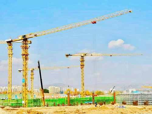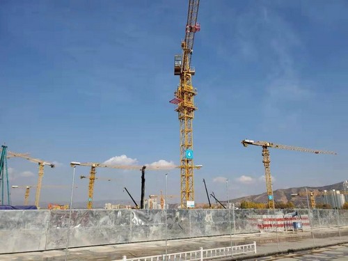 在蓝天白云的映衬下 蓝莓TV高清播放,适用于装配式建筑施工的多台徐工S系列塔机,以平稳高效的作业表现服务于“一带一路”(青海)国际会展中心项目。