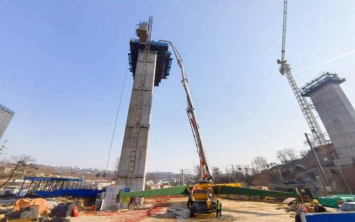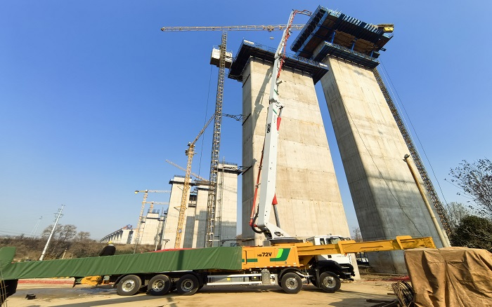 65米高空 蓝莓TV,72米长臂——在河南焦平高速施工现场,徐工72米泵车以“空中搭桥”之势攀越桥墩,稳稳输送。
